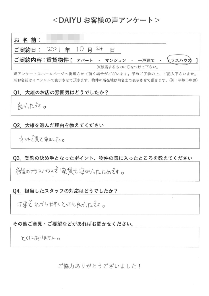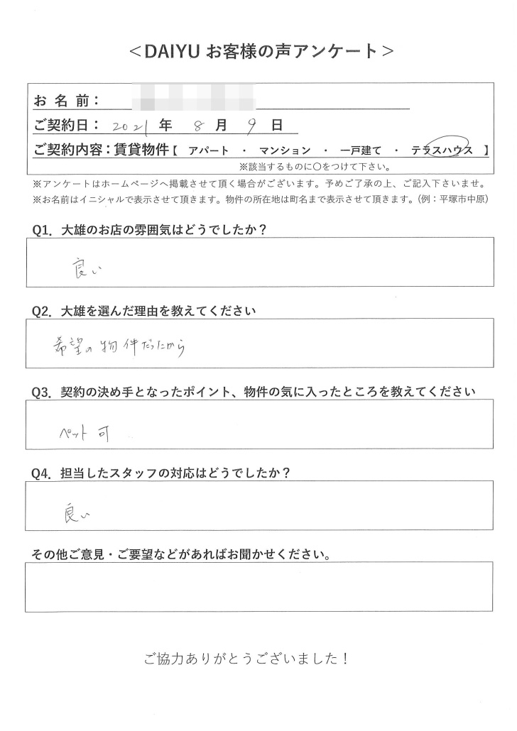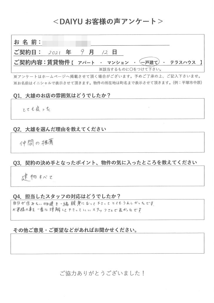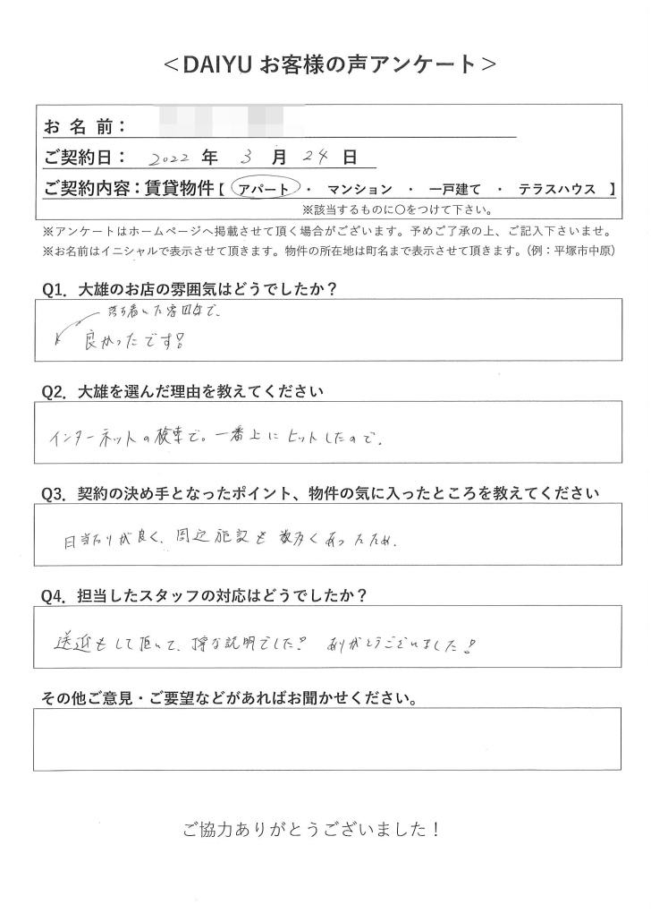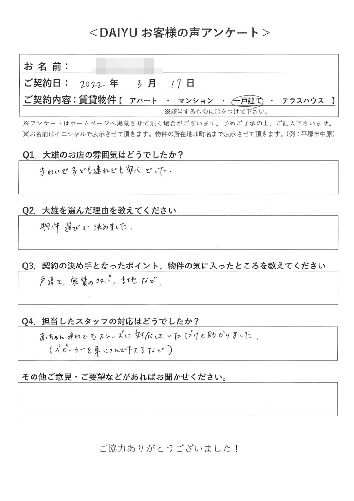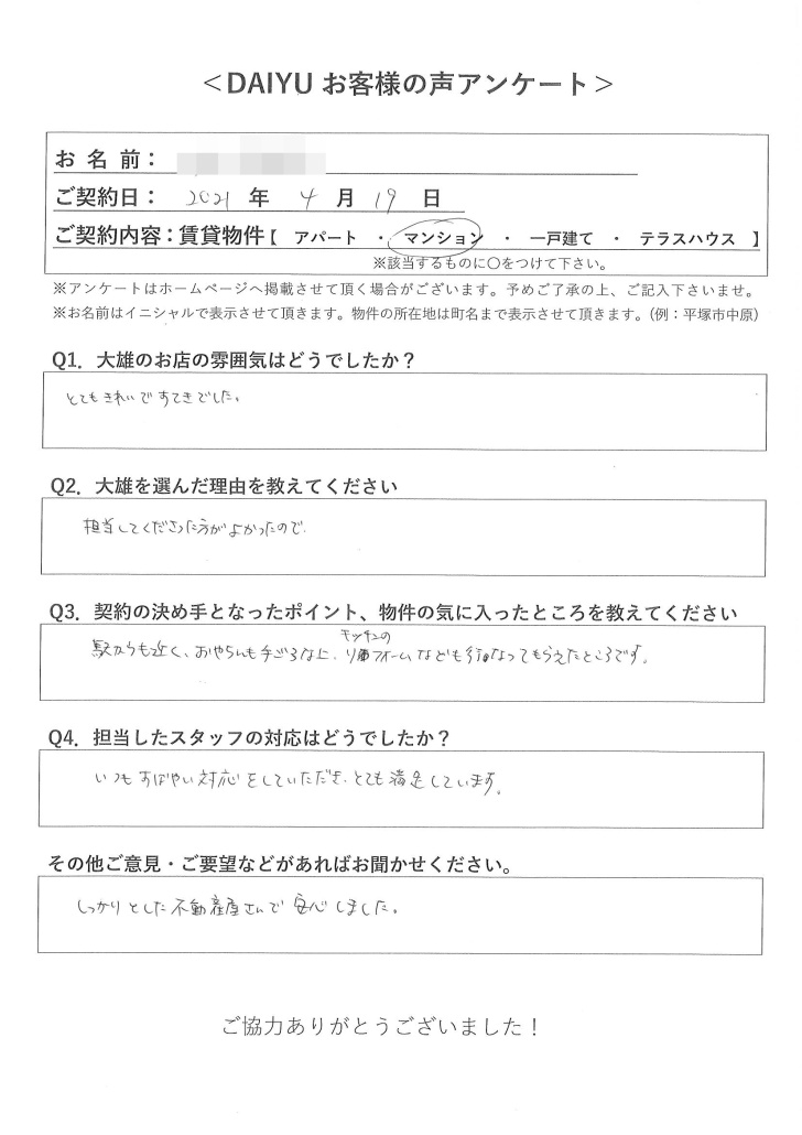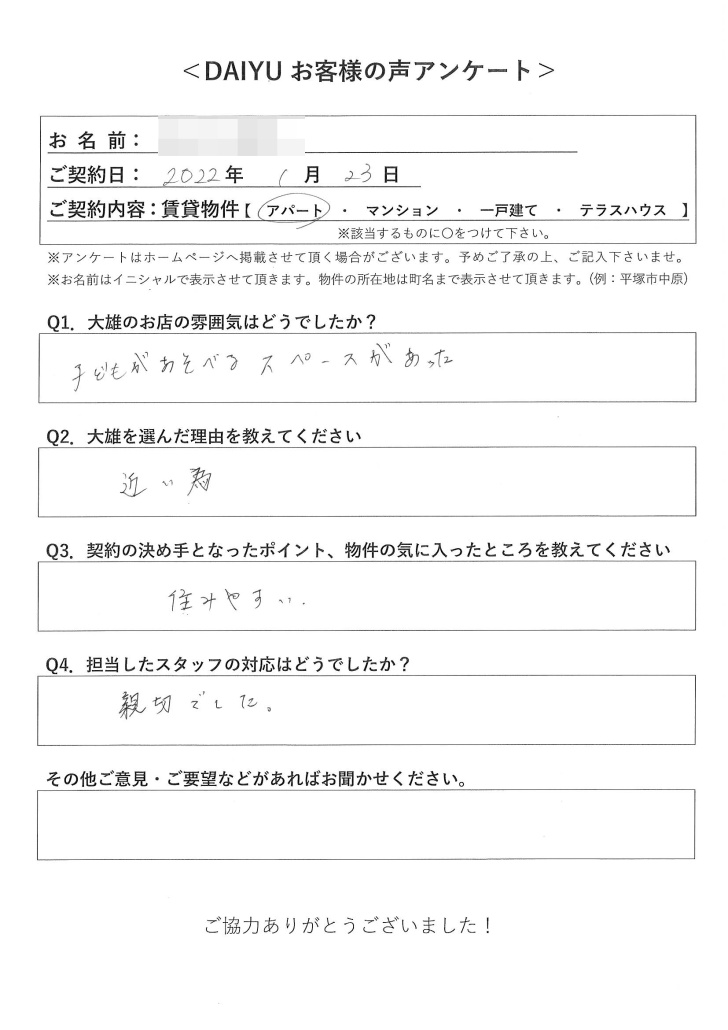 賃貸物件をご契約いただいた『お客様の声』を掲載させていただいております! 全体表示 売買物件 賃貸物件 建築・注文住宅 不動産管理 平塚市南豊田在住【N様】 平塚市四之宮在住【K様】 平塚市中原【H様】 平塚市長持【K様】 大磯町大磯【S様】 平塚市豊田宮下【N様】 平塚市南原在住【Y様】 平塚市撫子原在住【W様】 平塚市南豊田在住【K様】 平塚市東中原在住【M様】 平塚市南原在住【H様】 平塚市平塚在住【K様】 平塚市御殿在住【M様】 平塚市岡崎在住【K様】 平塚市御殿在住【A様】 平塚市中原在住【Y様】 平塚市豊田宮下在住【H様】 平塚市南原在住【A様】 平塚市八重咲町在住【M様】 平塚市代官町在住【A 様】 123 全体表示 売買物件 賃貸物件 建築・注文住宅 不動産管理